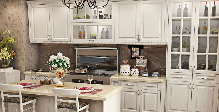 西尔维亚/ 这纯美的场景,宛如少女天真的笑容,柔和而愉悦情愫荡漾其间。至美至纯的白,简洁饱满的线条,独出心裁的岛台设计,静谧意境之间,浪漫如影随形。 米黄色的石英石台面,时尚清新的浅色调,白色门板上流水般的木纹,通透的十字玻璃门,传递着一种轻松而柔和的脉脉温情。